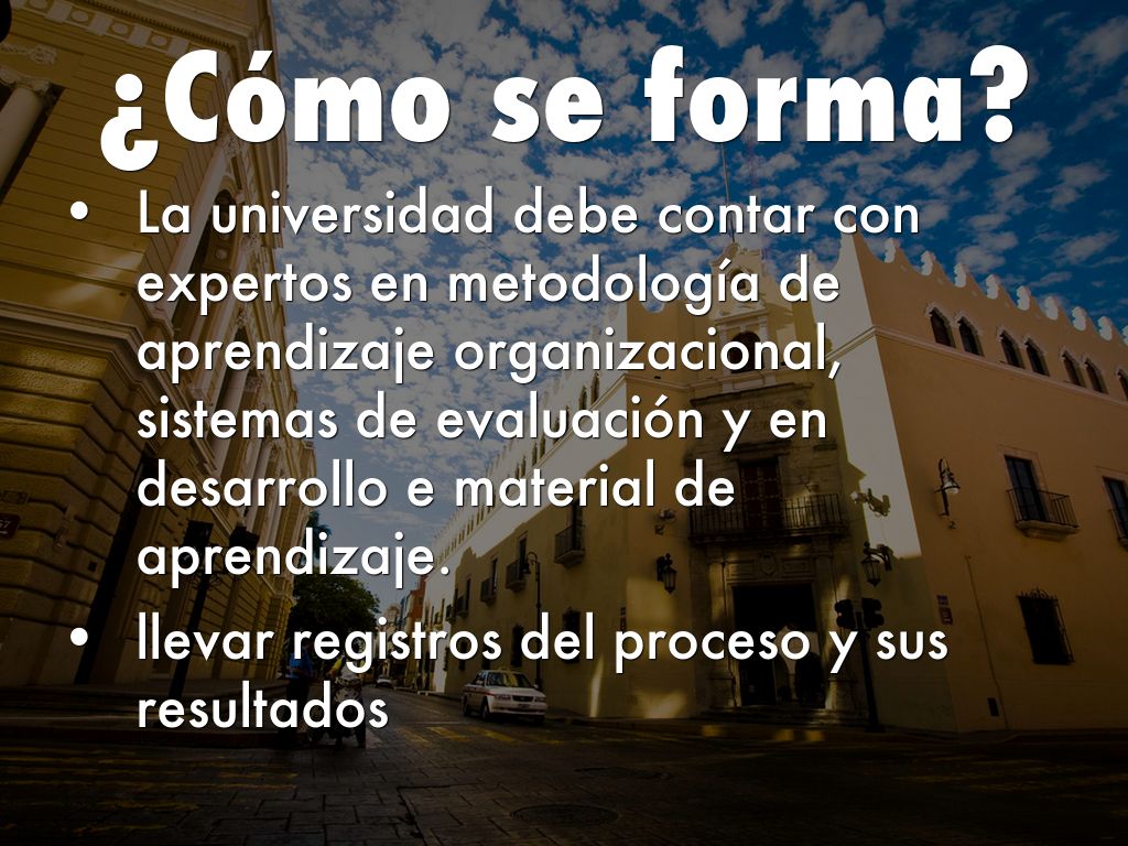 • La universidad debe contar con expertos en metodología de aprendizaje organizacional, sistemas de evaluación y en desarrollo e material de aprendizaje.
