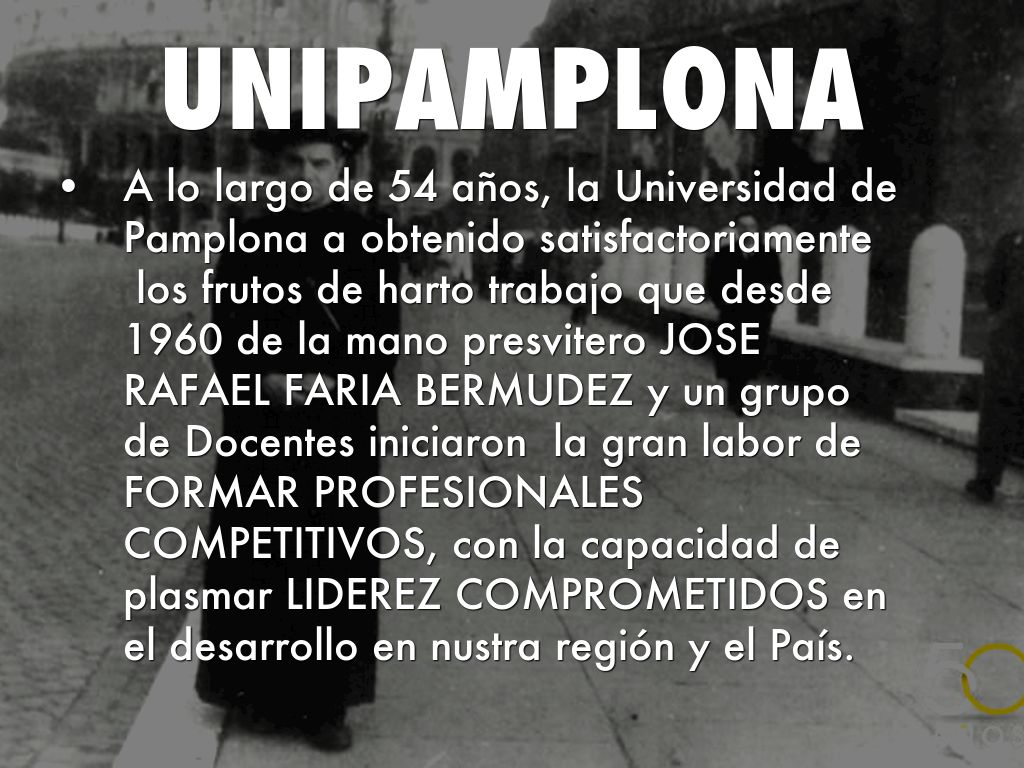 - A lo largo de 54 años, la Universidad de Pamplona a obtenido satisfactoriamente los frutos de harto trabajo que desde 1960 de la mano presvitero JOSE RAFAEL FARIA BERMUDEZ y un grupo de Docentes iniciaron la gran labor de FORMAR PROFESIONALES COMPETITIVOS, con la capacidad de plasmar LIDEREZ COMPROMETIDOS en el desarrollo en nustra región y el País.