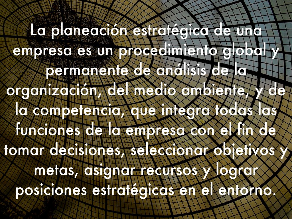 La planeación estratégica de una empresa es un procedimiento global y permanente de análisis de la organización, del medio ambiente, y de la competencia, que integra todas las funciones de la empresa con el fin de tomar decisiones, seleccionar objetivos y metas, asignar recursos y lograr posiciones estratégicas en el entorno.