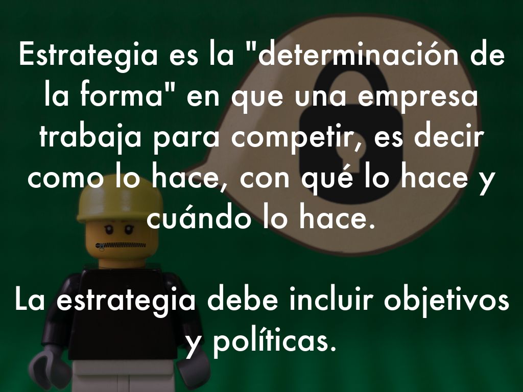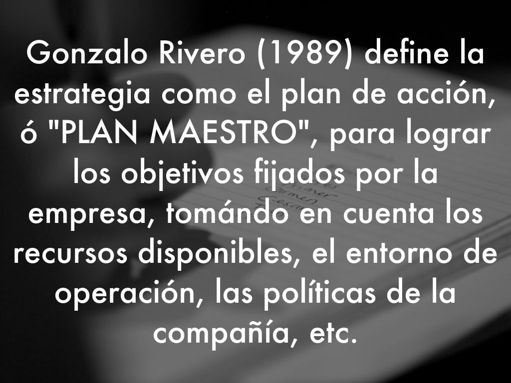 Gonzalo Rivero (1989) define la estrategia como el plan de acción, ó "PLAN MAESTRO", para lograr los objetivos fijados por la empresa, tomándo en cuenta los recursos disponibles, el entorno de operación, las políticas de la compañía, etc.