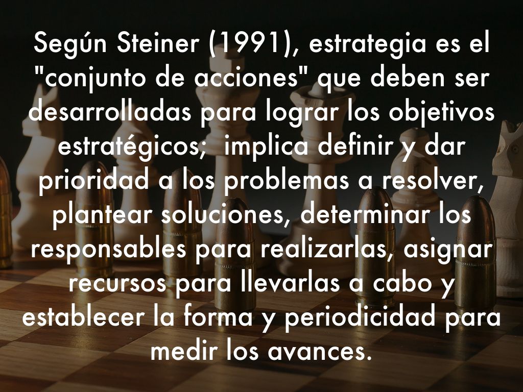 Según Steiner (1991), estrategia es el "conjunto de acciones" que deben ser desarrolladas para lograr los objetivos estratégicos; implica definir y dar prioridad a los problemas a resolver, plantear soluciones, determinar los responsables para realizarlas, asignar recursos para llevarlas a cabo y establecer la forma y periodicidad para medir los avances.