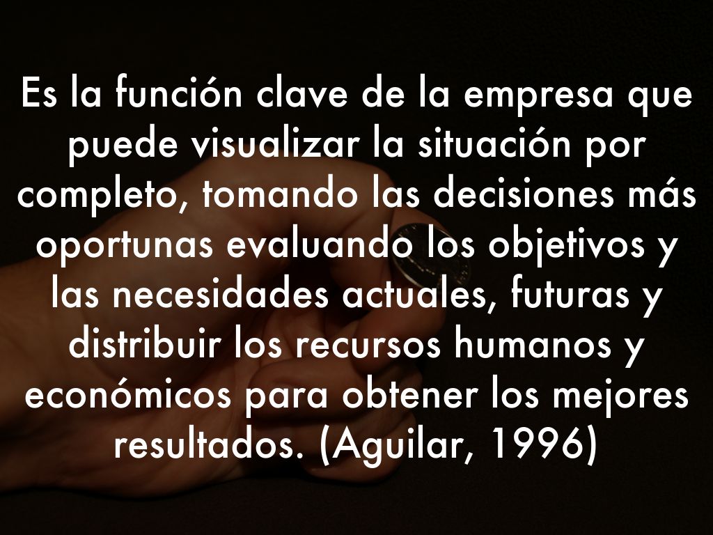 Es la función clave de la empresa que puede visualizar la situación por completo, tomando las decisiones más oportunas evaluando los objetivos y las necesidades actuales, futuras y distribuir los recursos humanos y económicos para obtener los mejores resultados. (Aguilar, 1996)