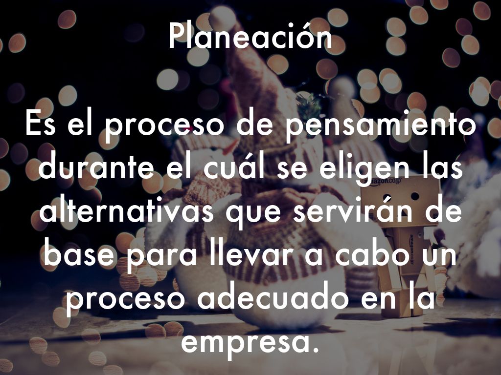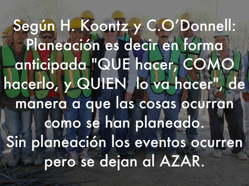 Según H. Koontz y C.O’Donnell: Planeación es decir en forma anticipada "QUE hacer, COMO hacerlo, y QUIEN lo va hacer", de manera a que las cosas ocurran como se han planeado. Sin planeación los eventos ocurren pero se dejan al AZAR.