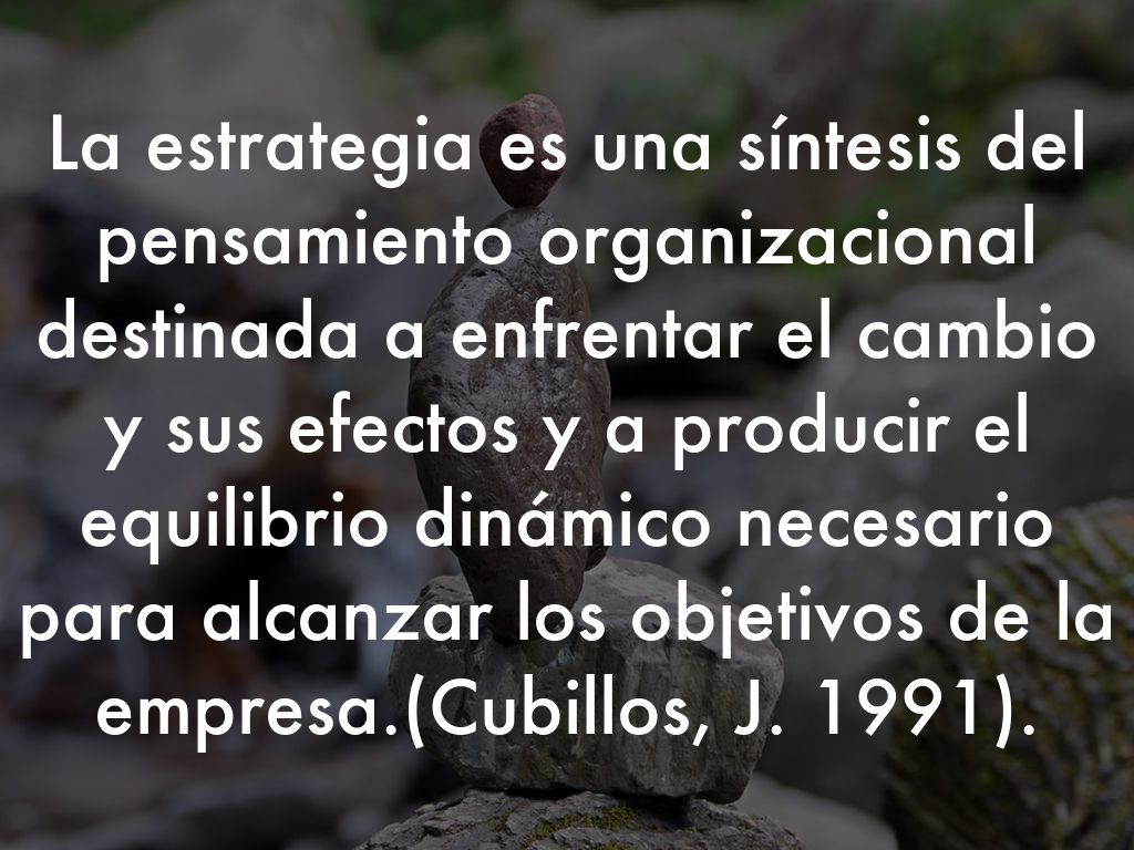 La estrategia es una síntesis del pensamiento organizacional destinada a enfrentar el cambio y sus efectos y a producir el equilibrio dinámico necesario para alcanzar los objetivos de la empresa.(Cubillos, J. 1991).