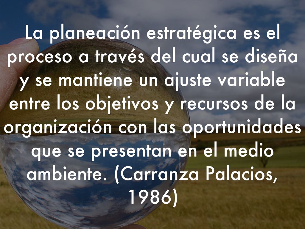 La planeación estratégica es el proceso a través del cual se diseña y se mantiene un ajuste variable entre los objetivos y recursos de la organización con las oportunidades que se presentan en el medio ambiente. (Carranza Palacios, 1986)