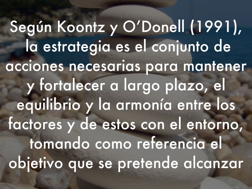 Según Koontz y O’Donell (1991), la estrategia es el conjunto de acciones necesarias para mantener y fortalecer a largo plazo, el equilibrio y la armonía entre los factores y de estos con el entorno, tomando como referencia el objetivo que se pretende alcanzar