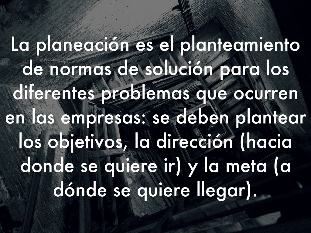 La planeación es el planteamiento de normas de solución para los diferentes problemas que ocurren en las empresas: se deben plantear los objetivos, la dirección (hacia donde se quiere ir) y la meta (a dónde se quiere llegar).
