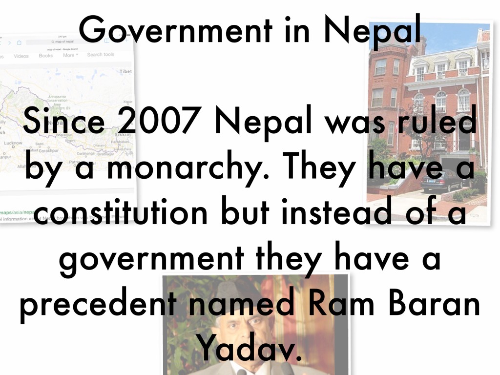 Since 2007 Nepal was ruled by a monarchy. They have a constitution but instead of a government they have a precedent named Ram Baran Yadav.
