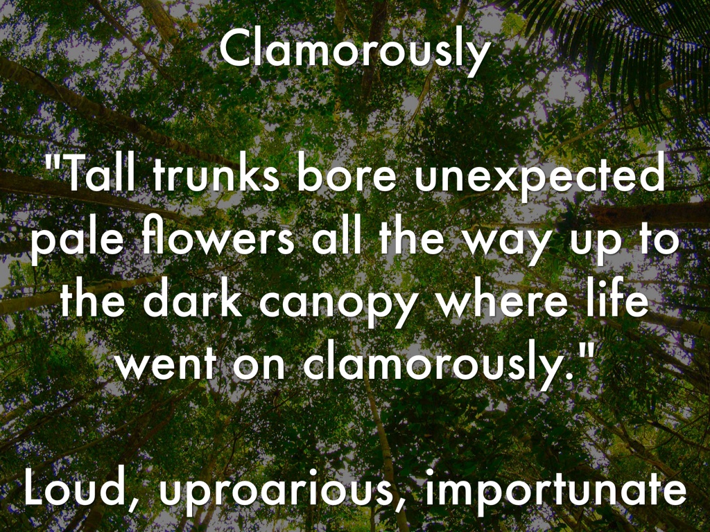 "Tall trunks bore unexpected pale flowers all the way up to the dark canopy where life went on clamorously."