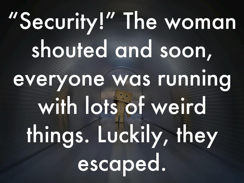 “Security!” The woman shouted and soon, everyone was running with lots of weird things. Luckily, they escaped.