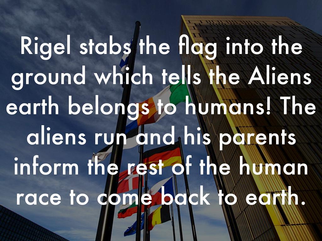 Rigel stabs the flag into the ground which tells the Aliens earth belongs to humans! The aliens run and his parents inform the rest of the human race to come back to earth.
