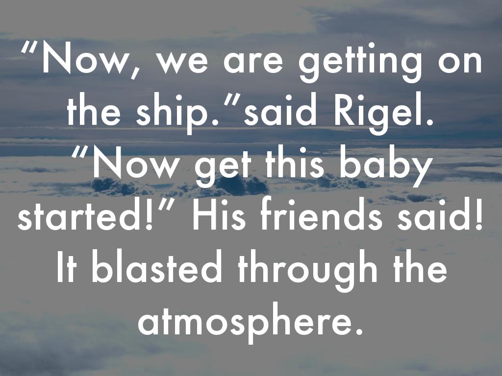 “Now, we are getting on the ship.”said Rigel. “Now get this baby started!” His friends said! It blasted through the atmosphere.