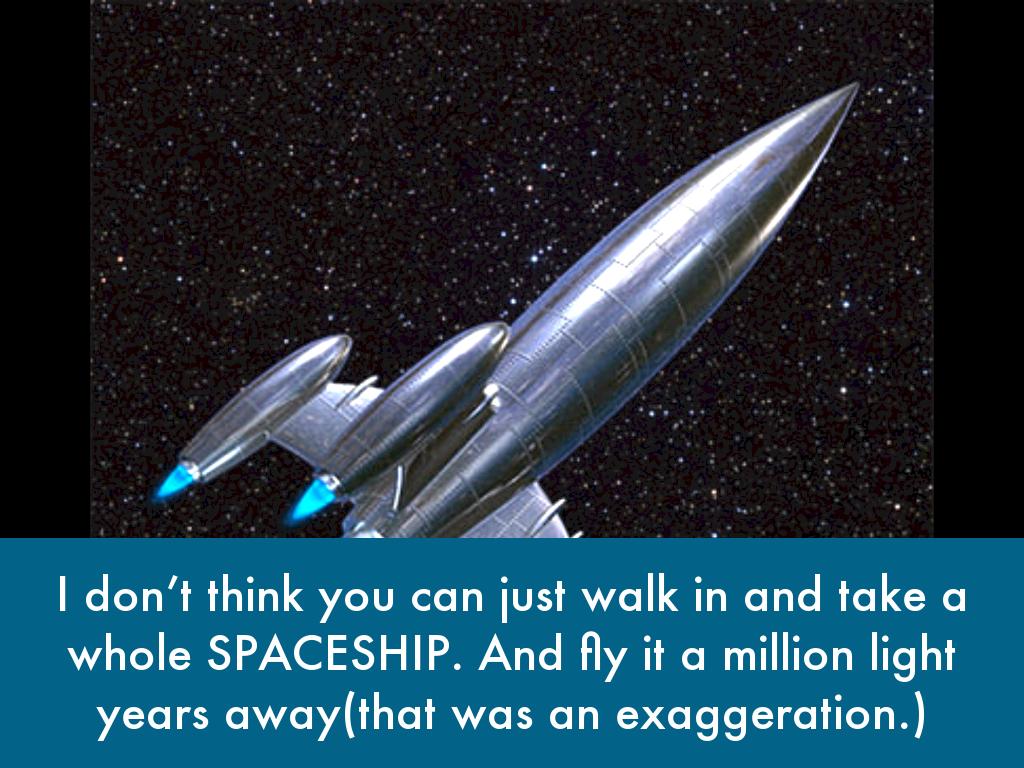 I don’t think you can just walk in and take a whole SPACESHIP. And fly it a million light years away(that was an exaggeration.)