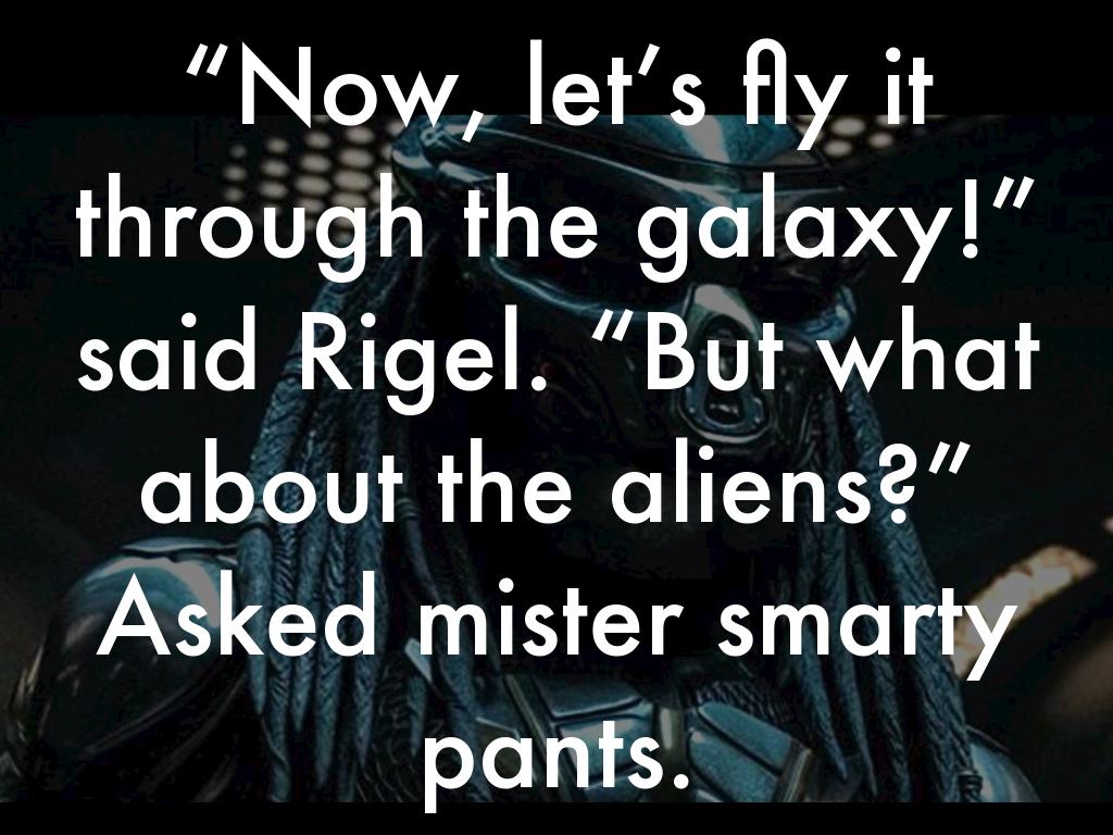 “Now, let’s fly it through the galaxy!” said Rigel. “But what about the aliens?” Asked mister smarty pants.