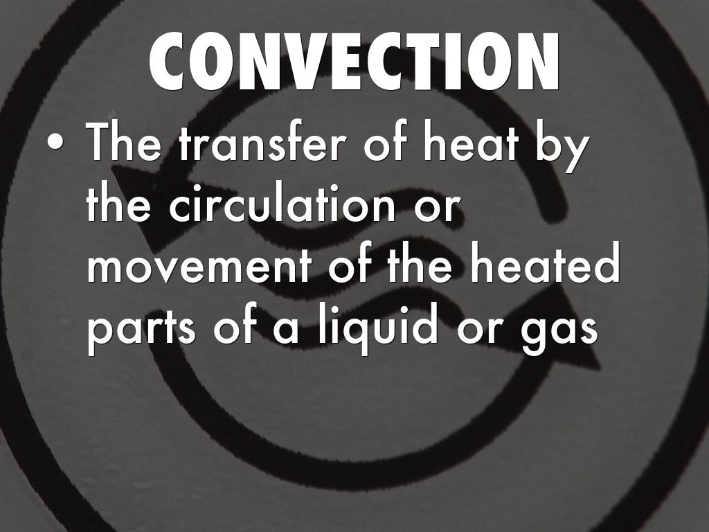 • The transfer of heat by the circulation or movement of the heated parts of a liquid or gas