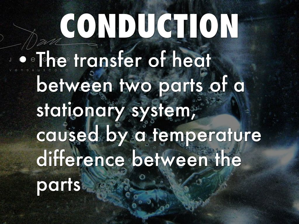 • The transfer of heat between two parts of a stationary system, caused by a temperature difference between the parts