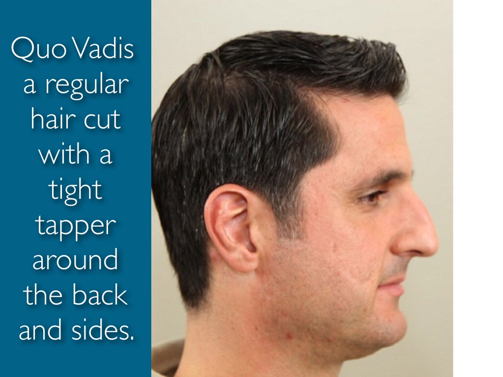 Quo Vadis a regular hair cut with a tight tapper around the back and sides.