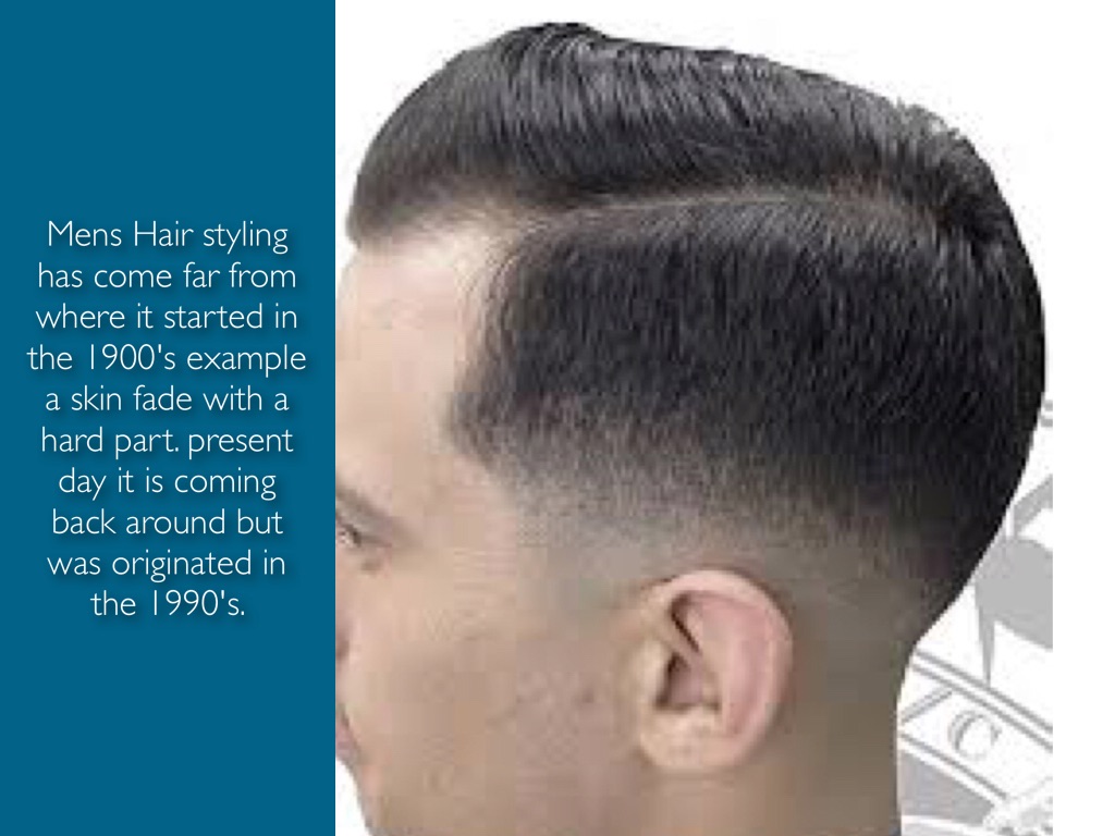 Mens Hair styling has come far from where it started in the 1900's example a skin fade with a hard part. present day it is coming back around but was originated in the 1990's.