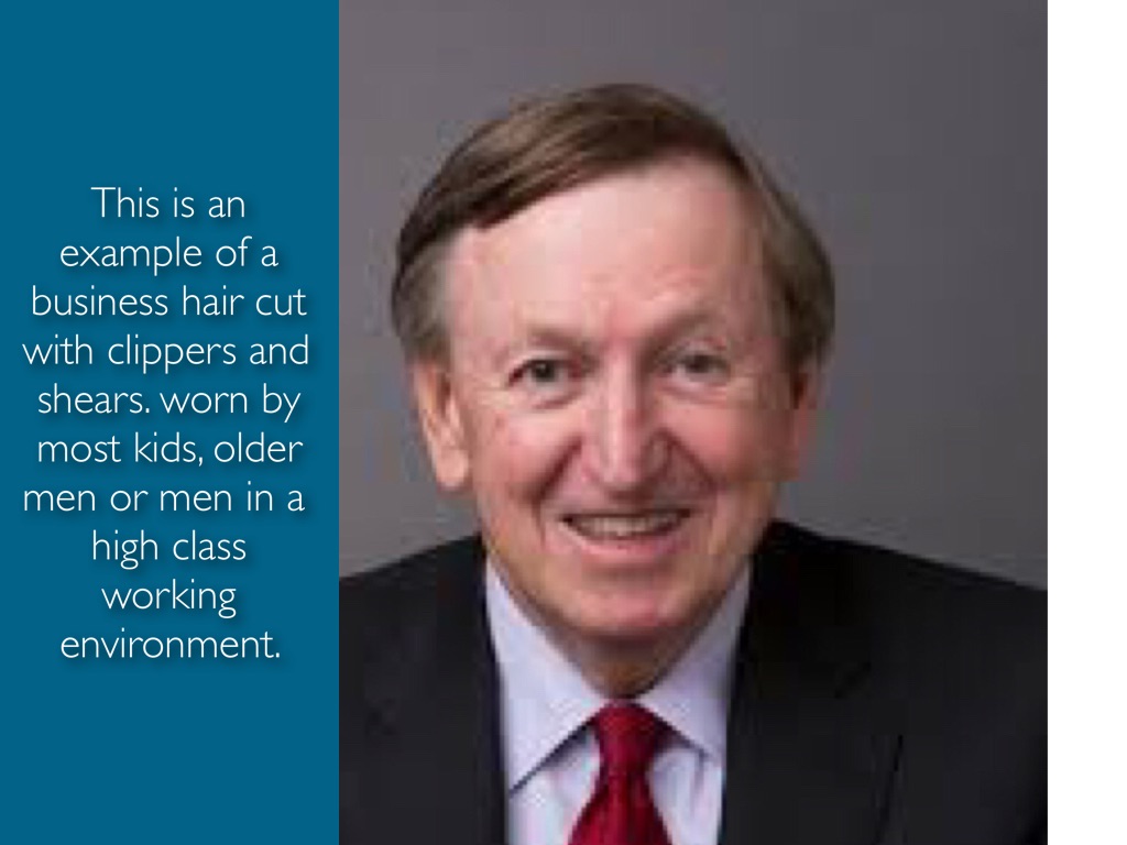 This is an example of a business hair cut with clippers and shears. worn by most kids, older men or men in a high class working environment.