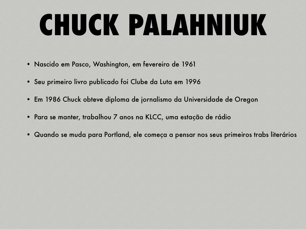 • Em 1999, Chuck ganha notoriedade com o lançamento nos cinemas do filme "Clube da Luta"