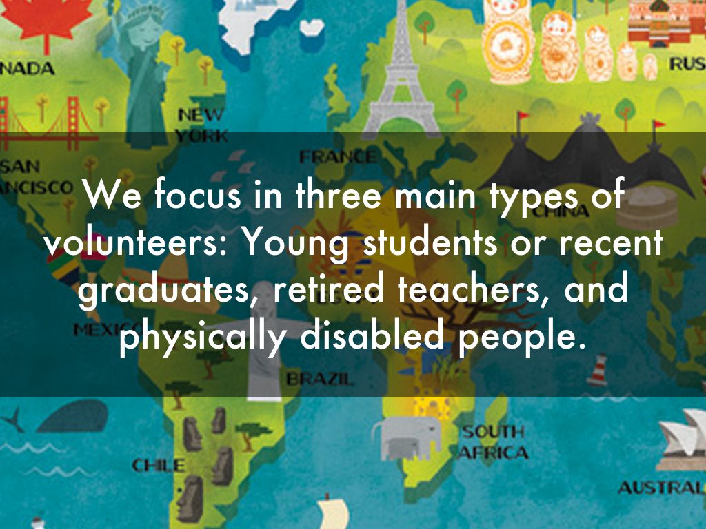 We focus in three main types of volunteers: Young students or recent graduates, retired teachers, and physically disabled people.
