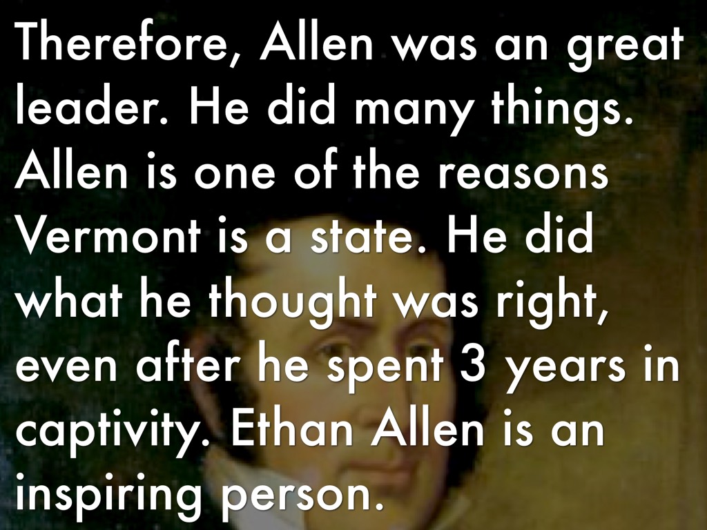 Therefore, Allen was an great leader. He did many things. Allen is one of the reasons Vermont is a state. He did what he thought was right, even after he spent 3 years in captivity. Ethan Allen is an inspiring person.