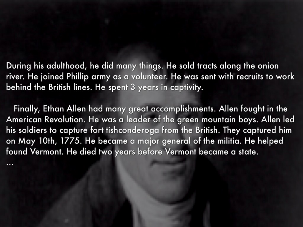 Finally, Ethan Allen had many great accomplishments. Allen fought in the American Revolution. He was a leader of the green mountain boys. Allen led his soldiers to capture fort tishconderoga from the British. They captured him on May 10th, 1775. He became a major general of the militia. He helped found Vermont. He died two years before Vermont became a state.