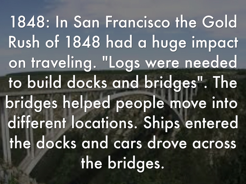 1848: In San Francisco the Gold Rush of 1848 had a huge impact on traveling. "Logs were needed to build docks and bridges". The bridges helped people move into different locations. Ships entered the docks and cars drove across the bridges.