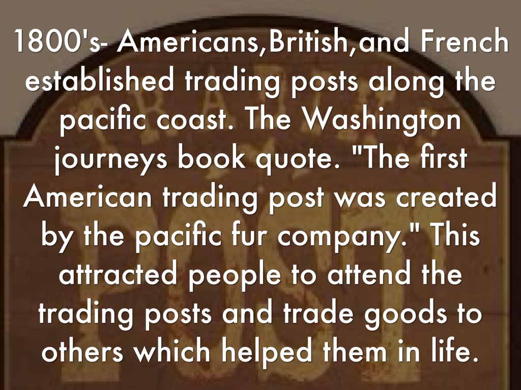 1800's- Americans,British,and French established trading posts along the pacific coast. The Washington journeys book quote. "The first American trading post was created by the pacific fur company." This attracted people to attend the trading posts and trade goods to others which helped them in life.