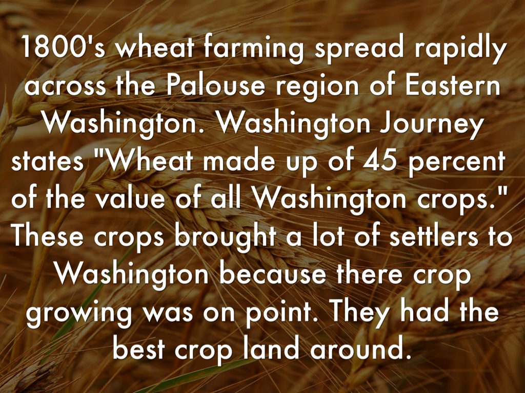 1800's wheat farming spread rapidly across the Palouse region of Eastern Washington. Washington Journey states "Wheat made up of 45 percent of the value of all Washington crops." These crops brought a lot of settlers to Washington because there crop growing was on point. They had the best crop land around.