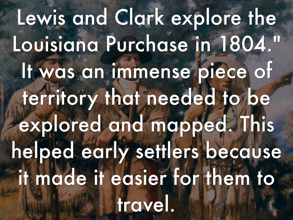 Lewis and Clark explore the Louisiana Purchase in 1804." It was an immense piece of territory that needed to be explored and mapped. This helped early settlers because it made it easier for them to travel.