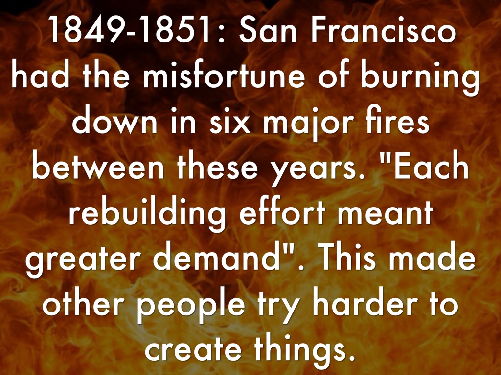 1849-1851: San Francisco had the misfortune of burning down in six major fires between these years. "Each rebuilding effort meant greater demand". This made other people try harder to create things.