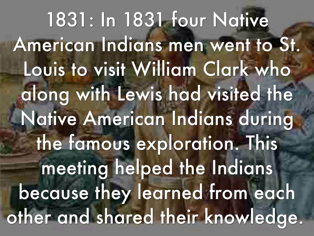 1831: In 1831 four Native American Indians men went to St. Louis to visit William Clark who along with Lewis had visited the Native American Indians during the famous exploration. This meeting helped the Indians because they learned from each other and shared their knowledge.