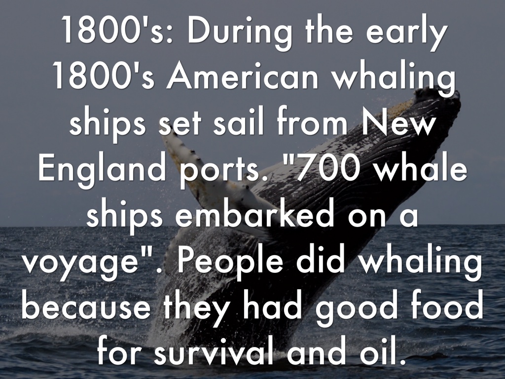 1800's: During the early 1800's American whaling ships set sail from New England ports. "700 whale ships embarked on a voyage". People did whaling because they had good food for survival and oil.