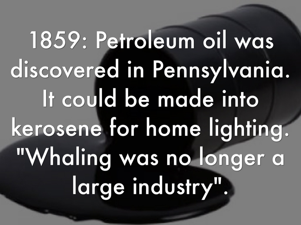 1859: Petroleum oil was discovered in Pennsylvania. It could be made into kerosene for home lighting. "Whaling was no longer a large industry".