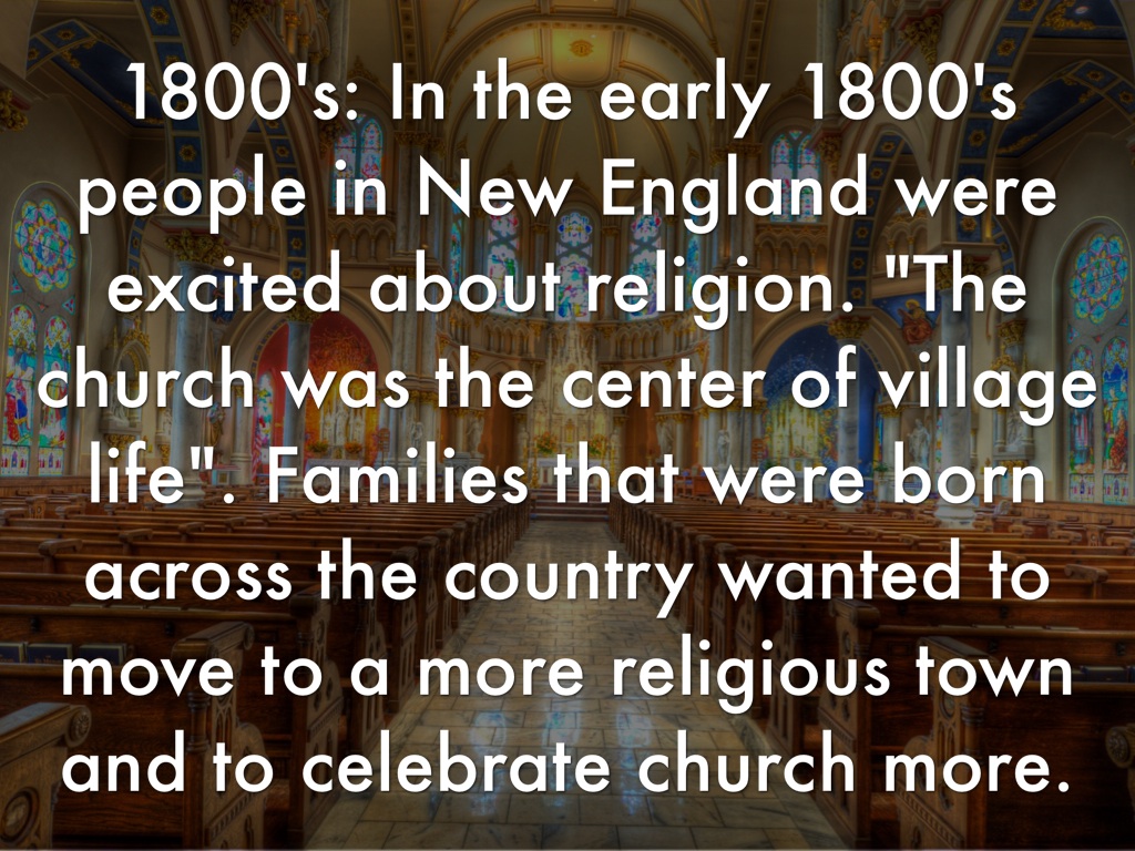 1800's: In the early 1800's people in New England were excited about religion. "The church was the center of village life". Families that were born across the country wanted to move to a more religious town and to celebrate church more.
