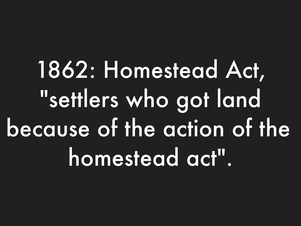 1862: Homestead Act, "settlers who got land because of the action of the homestead act".