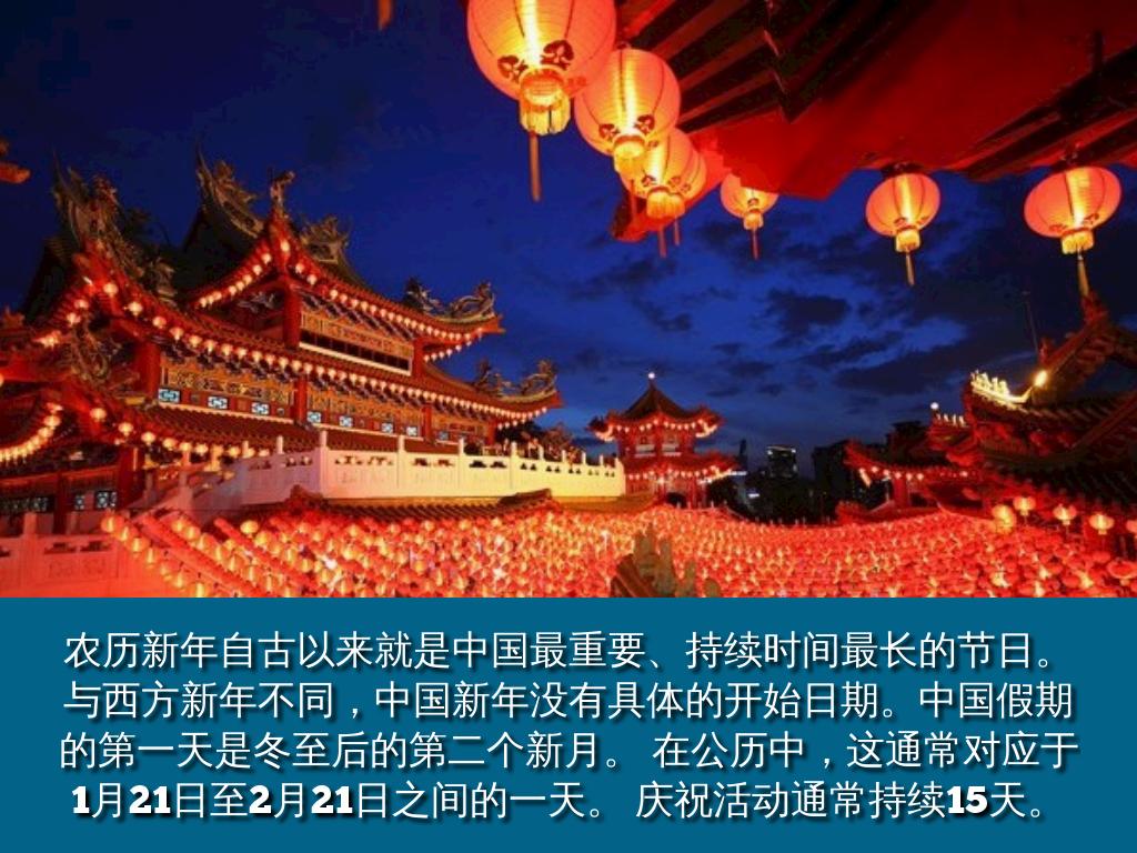 农历新年自古以来就是中国最重要、持续时间最长的节日。 与西方新年不同,中国新年没有具体的开始日期。中国假期的第一天是冬至后的第二个新月。 在公历中,这通常对应于1月21日至2月21日之间的一天。 庆祝活动通常持续15天。