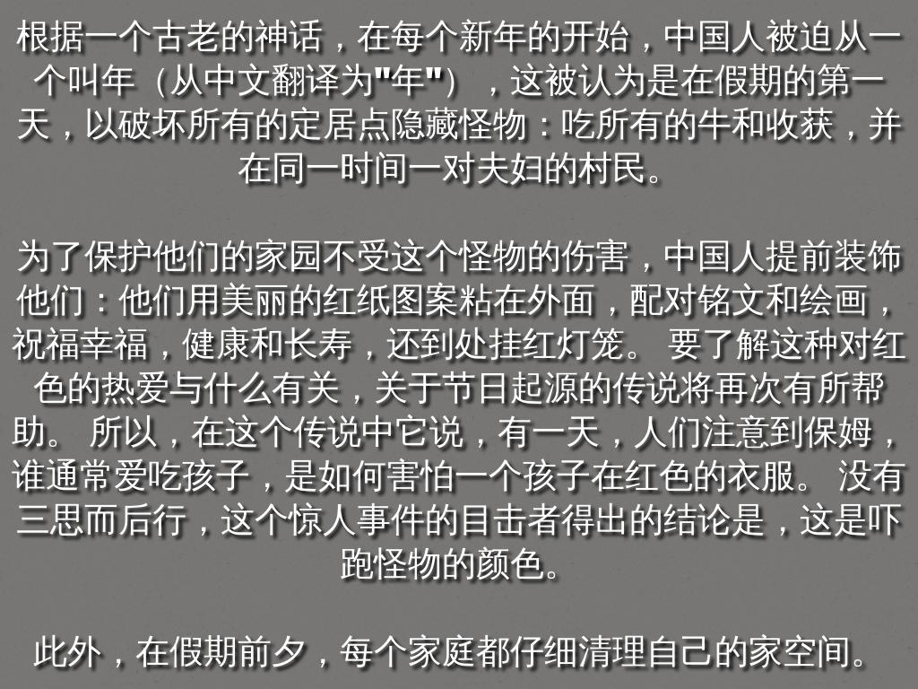 根据一个古老的神话,在每个新年的开始,中国人被迫从一个叫年(从中文翻译为"年"),这被认为是在假期的第一天,以破坏所有的定居点隐藏怪物:吃所有的牛和收获,并在同一时间一对夫妇的村民。