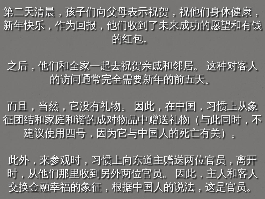 此外,到了节日的晚餐,即使是那些在其他城市或国家工作或学习的家庭成员也会回家。 所有中国人都努力与父母一起庆祝新年,因此,在假期前夕,该国的所有交通工具都很拥挤,根本无法购买门票。