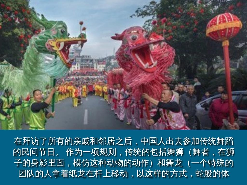 在拜访了所有的亲戚和邻居之后,中国人出去参加传统舞蹈的民间节日。 作为一项规则,传统的包括舞狮(舞者,在狮子的身影里面,模仿这种动物的动作)和舞龙(一个特殊的团队的人拿着纸龙在杆上移动,以这样的方式,蛇般的体