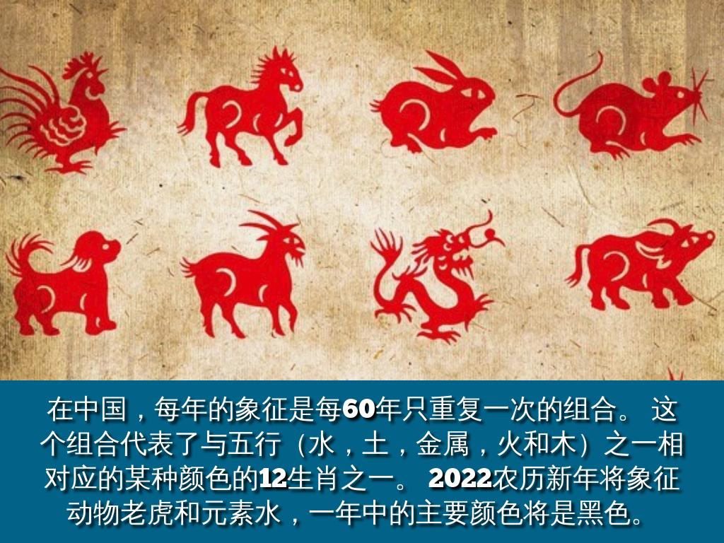 在中国,每年的象征是每60年只重复一次的组合。 这个组合代表了与五行(水,土,金属,火和木)之一相对应的某种颜色的12生肖之一。 2022农历新年将象征动物老虎和元素水,一年中的主要颜色将是黑色。