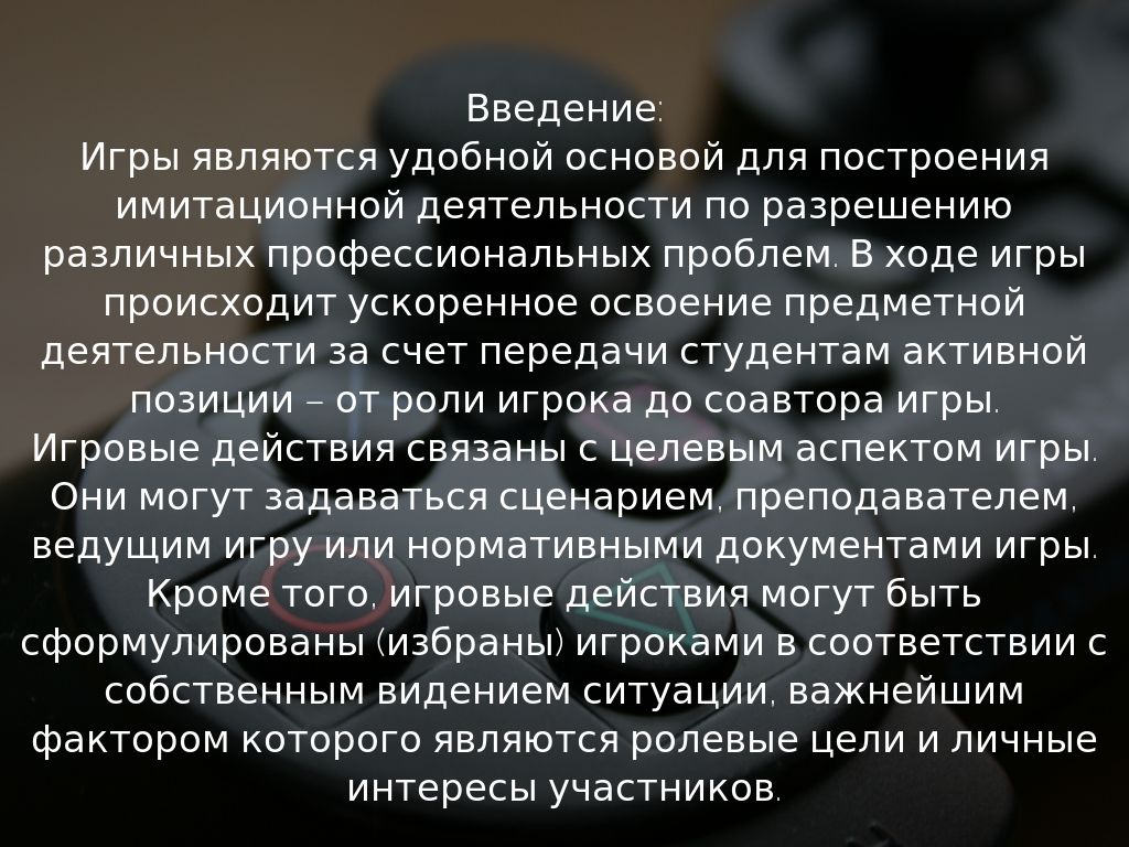 Введение: Игры являются удобной основой для построения имитационной деятельности по разрешению различных профессиональных проблем. В ходе игры происходит ускоренное освоение предметной деятельности за счет передачи студентам активной позиции – от роли игрока до соавтора игры. Игровые действия связаны с целевым аспектом игры. Они могут задаваться сценарием, преподавателем, ведущим игру или нормативными документами игры. Кроме того, игровые действия могут быть сформулированы (избраны) игроками в соответствии с собственным видением ситуации, важнейшим фактором которого являются ролевые цели и личные интересы участников.