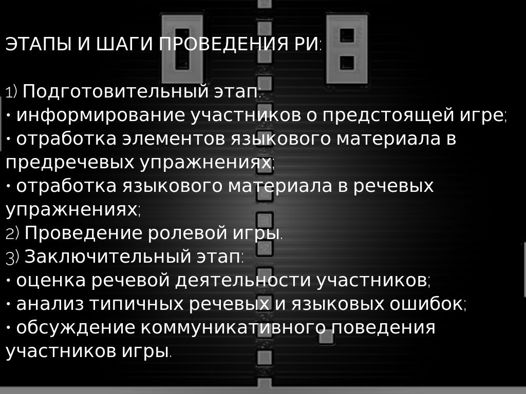 1) Подготовительный этап: • информирование участников о предстоящей игре; • отработка элементов языкового материала в предречевых упражнениях; • отработка языкового материала в речевых упражнениях; 2) Проведение ролевой игры. 3) Заключительный этап: • оценка речевой деятельности участников; • анализ типичных речевых и языковых ошибок; • обсуждение коммуникативного поведения участников игры.