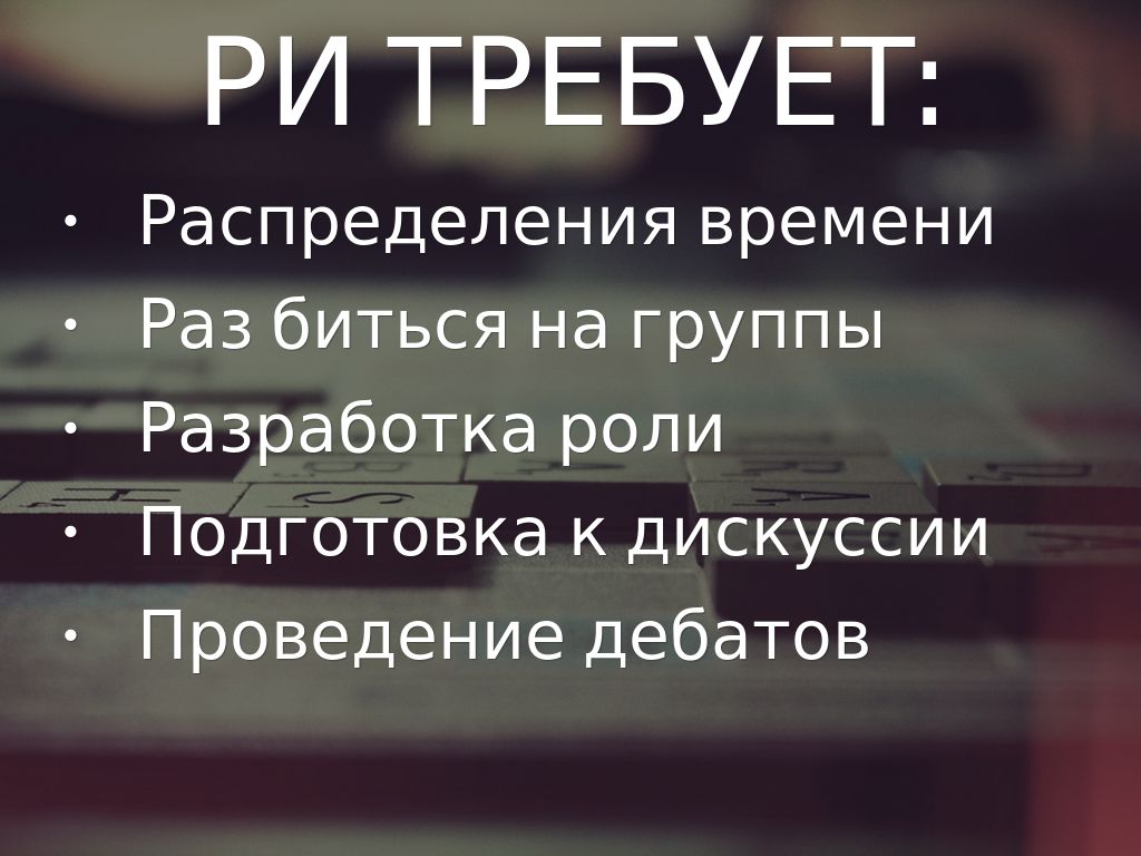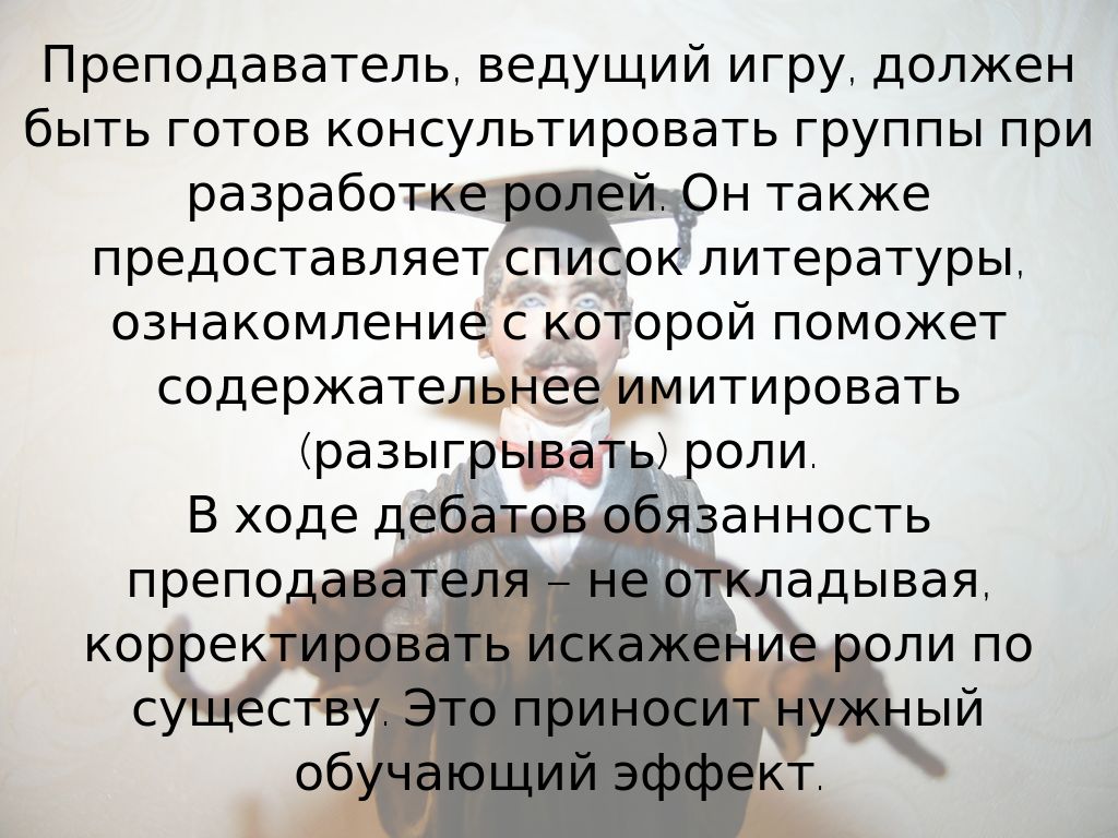 Преподаватель, ведущий игру, должен быть готов консультировать группы при разработке ролей. Он также предоставляет список литературы, ознакомление с которой поможет содержательнее имитировать (разыгрывать) роли. В ходе дебатов обязанность преподавателя – не откладывая, корректировать искажение роли по существу. Это приносит нужный обучающий эффект.