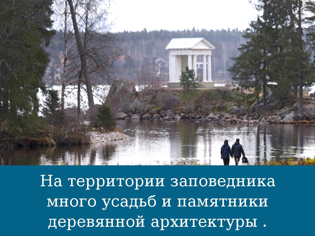 На территории заповедника много усадьб и памятники деревянной архитектуры .