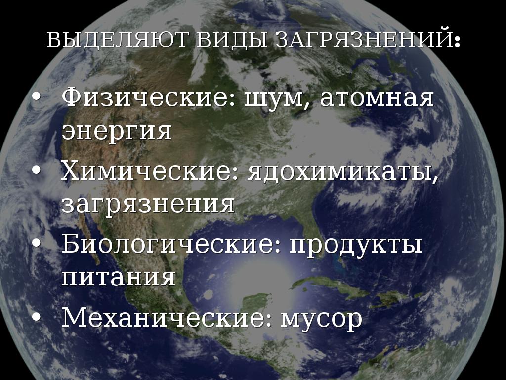 ВЫДЕЛЯЮТ ВИДЫ ЗАГРЯЗНЕНИЙ: