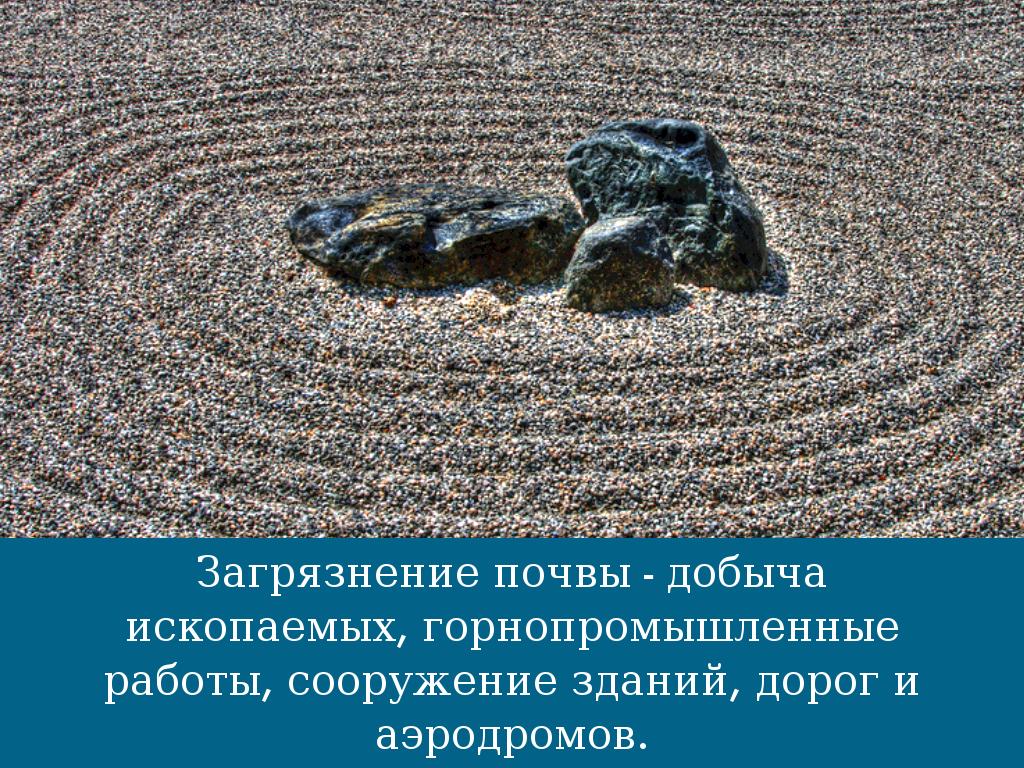 Загрязнение почвы - добыча ископаемых, горнопромышленные работы, сооружение зданий, дорог и аэродромов.