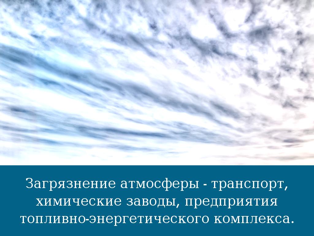 Загрязнение атмосферы - транспорт, химические заводы, предприятия топливно-энергетического комплекса.