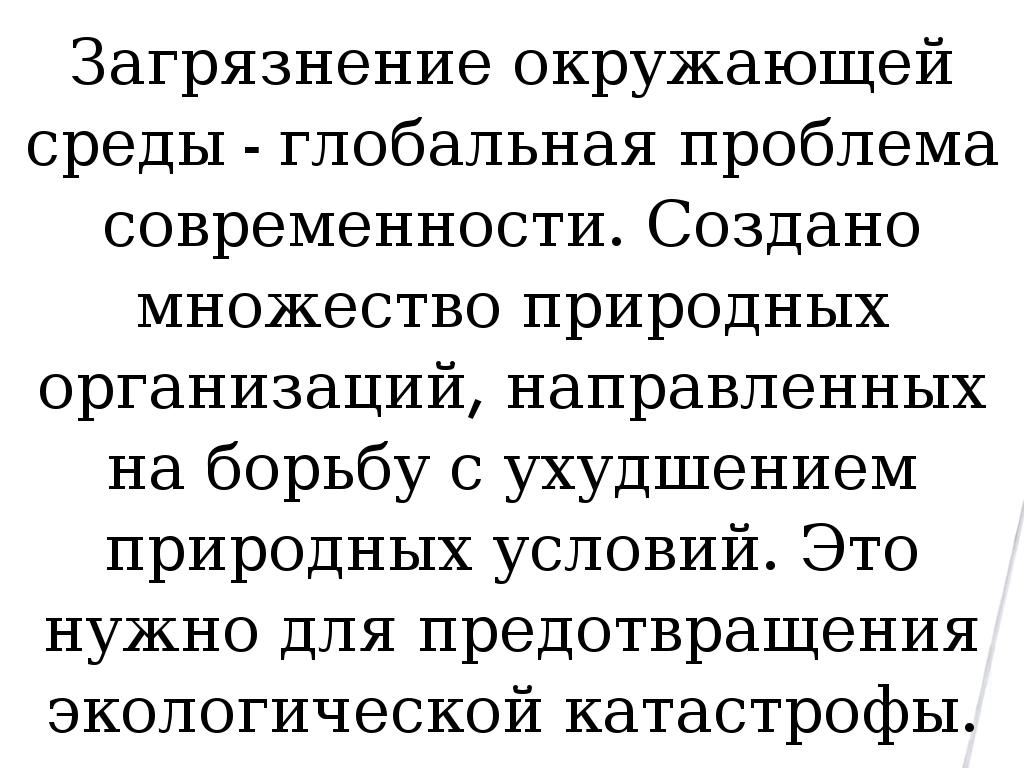 Загрязнение окружающей среды - глобальная проблема современности. Создано множество природных организаций, направленных на борьбу с ухудшением природных условий. Это нужно для предотвращения экологической катастрофы.